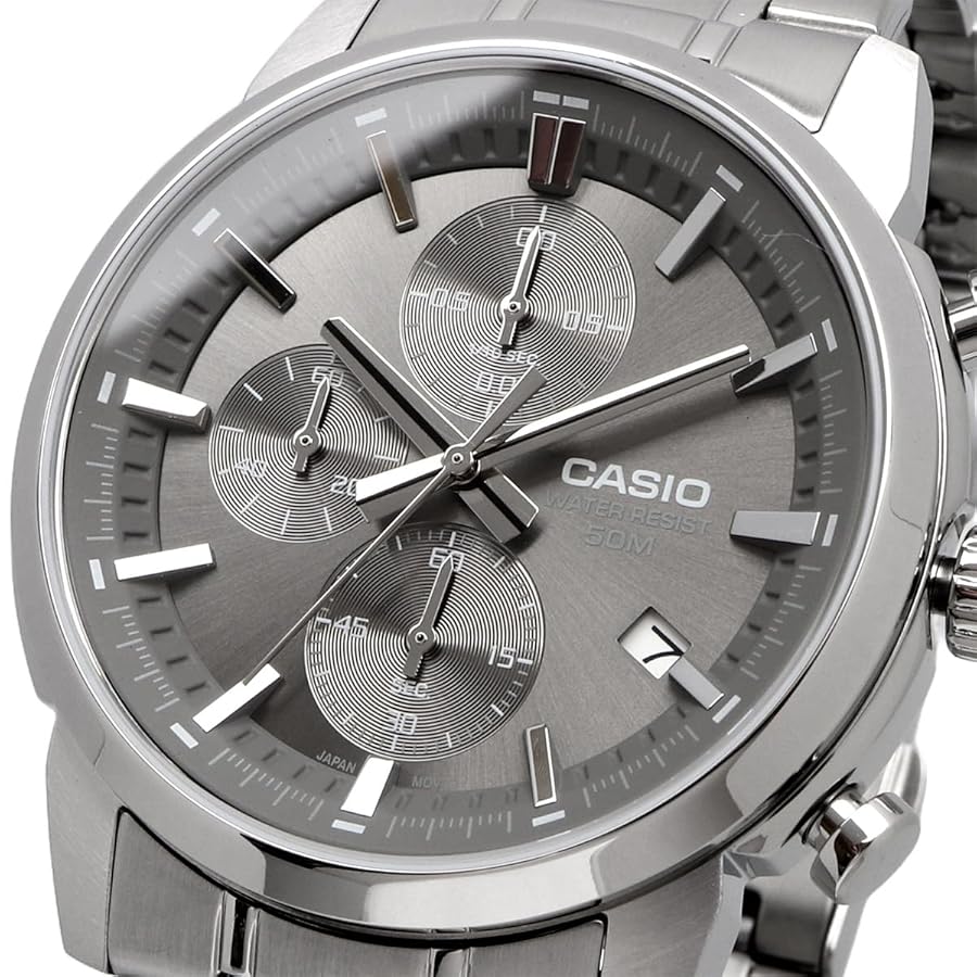 Analog: 3 hands (hour, minute, second), 3 dials (stopwatch 1/10 seconds, stopwatch minutes, stopwatch seconds)